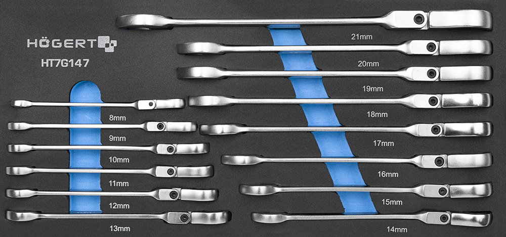 Набор рожково-накидных ключей с трещоткой и шарниром 14 шт., HT7G147