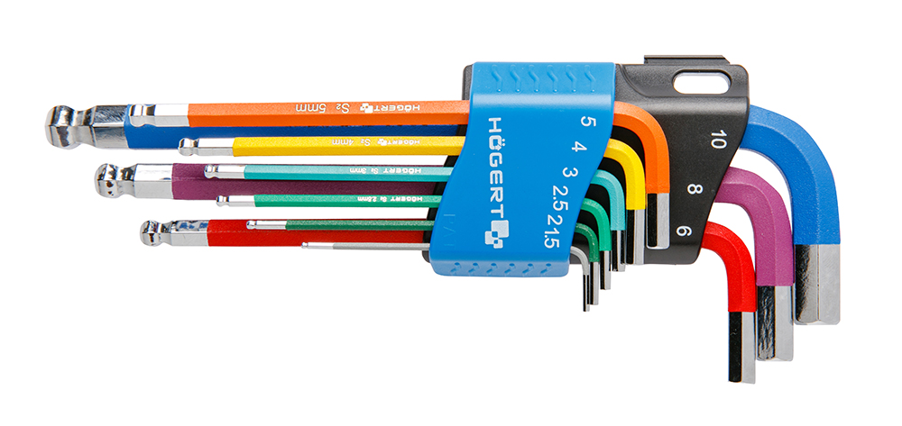 Набор имбусовых ключей с шестигранным сечением с цветной маркировкой, гарантирующей быструю идентификацию размеров.